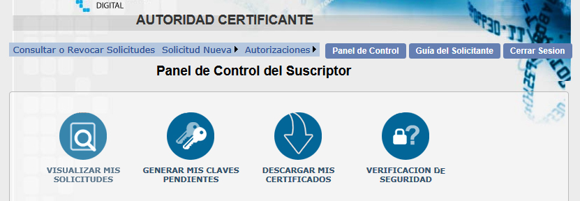 5. Dentro de la pantalla “1er Paso: Solicitante / Suscriptor”, seleccionar el ítem del menú: Consultar o Revocar Solicitudes