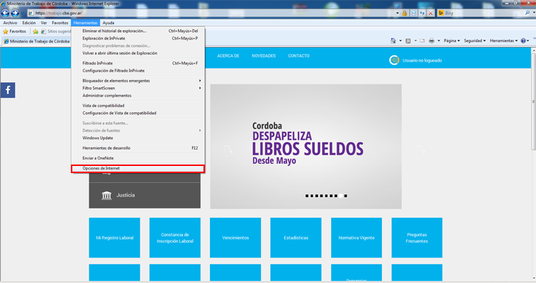 Al abrir la pagina trabajo.cba.gov.ar necesitaremos que ésta pagina esté dentro de la lista de los sitios seguros de nuestro Internet Explorer, a continuación se detallan los pasos a seguir.