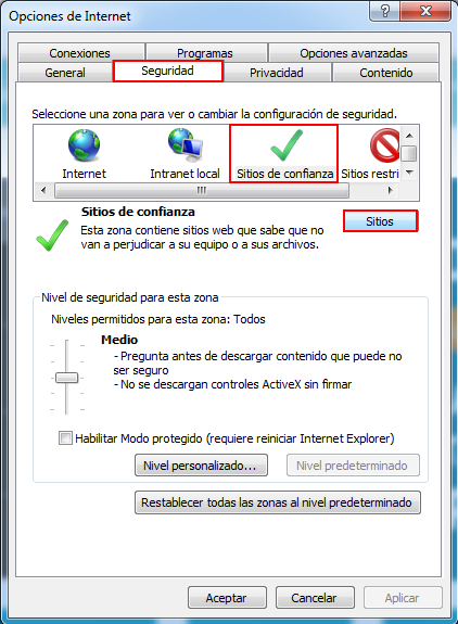 2. A continuación aparecera la caja de opciones de internet en la cual seleccionaremos la solapa Seguridad, dentro de ella el icono Sitios de Confianza y Luego el botón Sitios.
