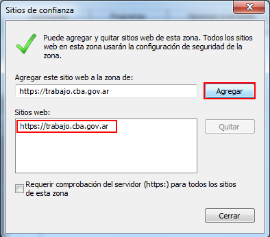 3. Aparecera una ventana nueva en la cual la dirección web ya estara escrita, solo deberemos presionar el botón agregar, de esta forma quedara agregada la dirección web a los sitios seguros, ahora cerraremos esta ventana con el botón cerrar y luego Aceptar en la ventana de opciones de Internet.