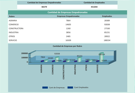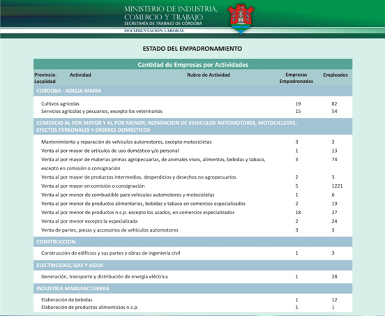 Al mismo tiempo el Ministerio de Trabajo, Empleo y Seguridad Social cuenta en su base de datos con el padrón de empresas y el padrón general de empleados, ambos discriminados por Actividades, Categorías, Localidades, Cantidad de Empleados, Sexo, Edades, Obra Social entre otros. La información estadística en línea, consistente y segmentada por los distintos criterios de interés del usuario, es el primer efecto positivo de esta actividad de empadronamiento.