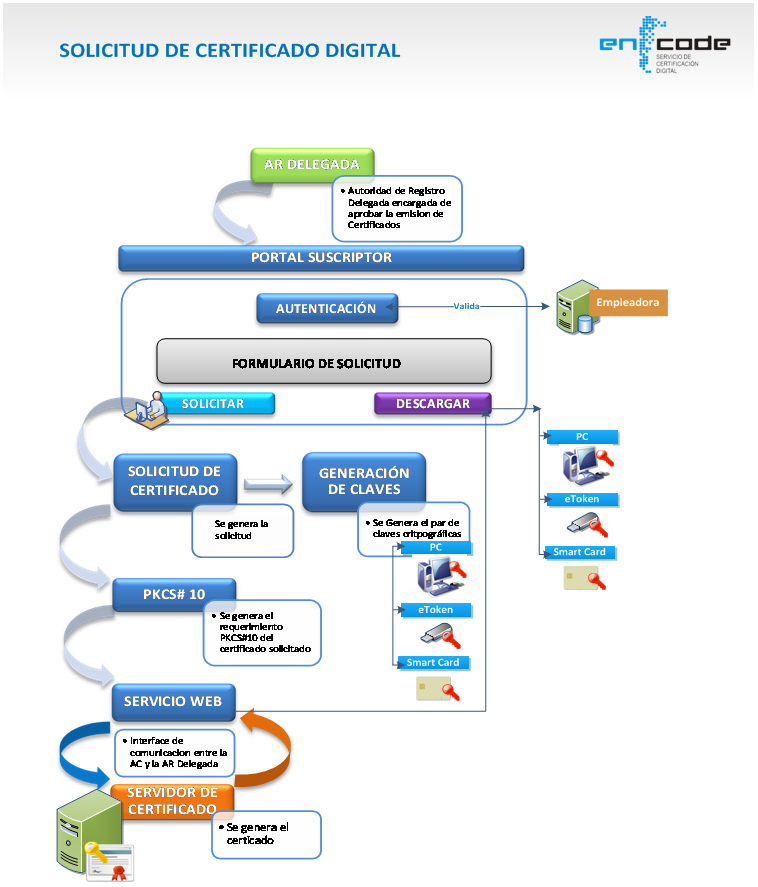 La clave privada generada es almacenada en el dispositivo conectado o en un equipo de uso exclusivo y el archivo de requerimientos PKCS#10 es enviado al Servicio Web de la Autoridad Certificante de ENCODE, encargada de la Emisión de Certificados Digitales.