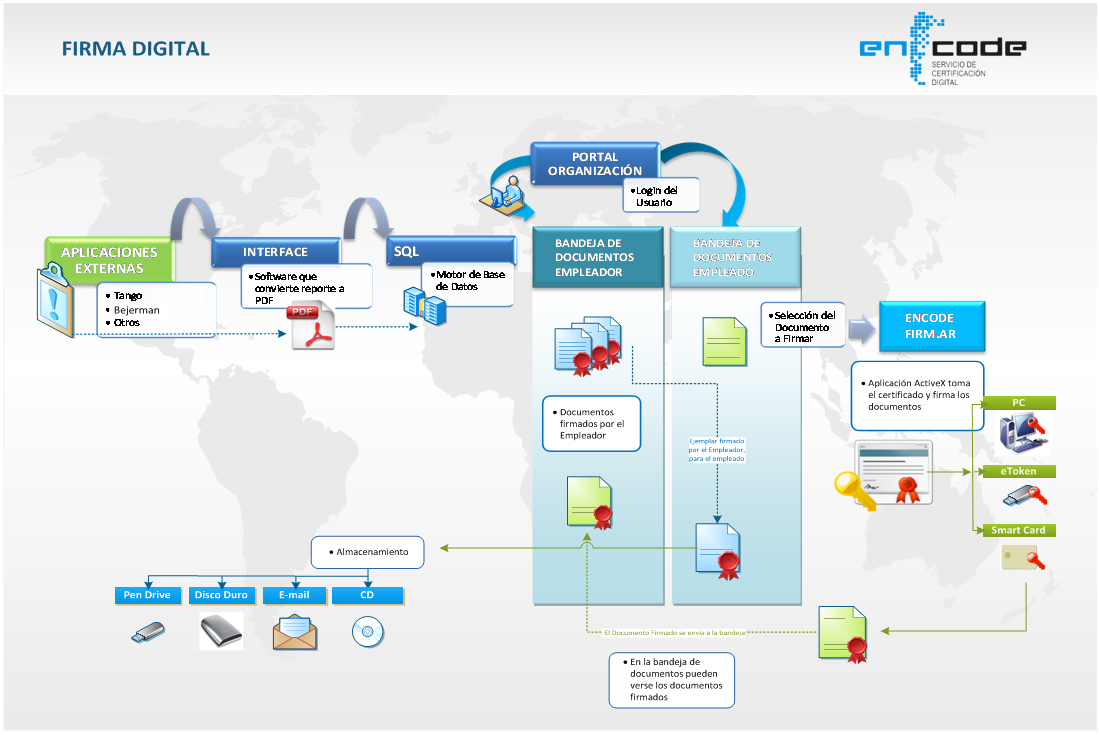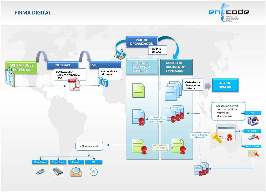 Cada empleado será un Suscriptor de un Certificado de Empleado y los responsables de firmar en representación de la firma Empleadora serán Suscriptores de Certificado de Empleador. La documentación con la cual se verifica la identidad (Documento de Identidad) quedará archivada en la empresa bajo su estricta responsabilidad por cuenta y orden de ENCODE. Una vez identificada la persona por la Autoridad de Registro, esta autoriza la solicitud del certificado. ENCODE envía al empleado el Certificado necesario que lo habilita para firmar, al mail indicado por este para que lo instale en una PC, o en una notebook, o en una tarjeta SmartCard, o en un dispositivo eToken, o en un móvil(telefonía celular) o en una Tablet. Luego de instalado el Certificado sirve para firmar cualquier documento de los arriba mencionados y tiene una duración de un año. Si el Suscriptor renueva su Certificado antes de su vencimiento no debe identificarse nuevamente, el sistema si el empleado sigue estando activo automáticamente solicita dicha renovación 30 días antes de su vencimiento.